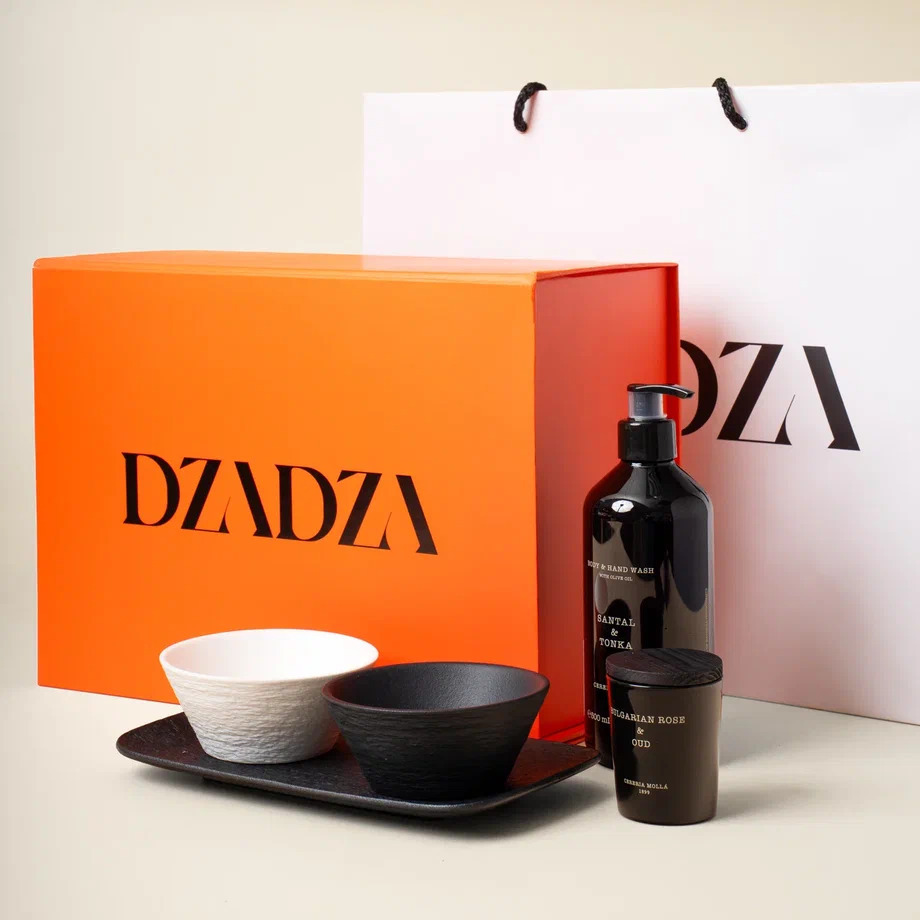 Сет представлен с наполнением: бокс, пиала черная и белая, жидкое мыло, свеча