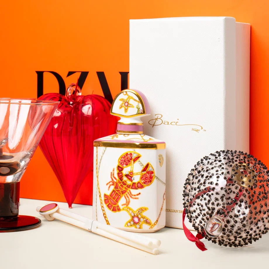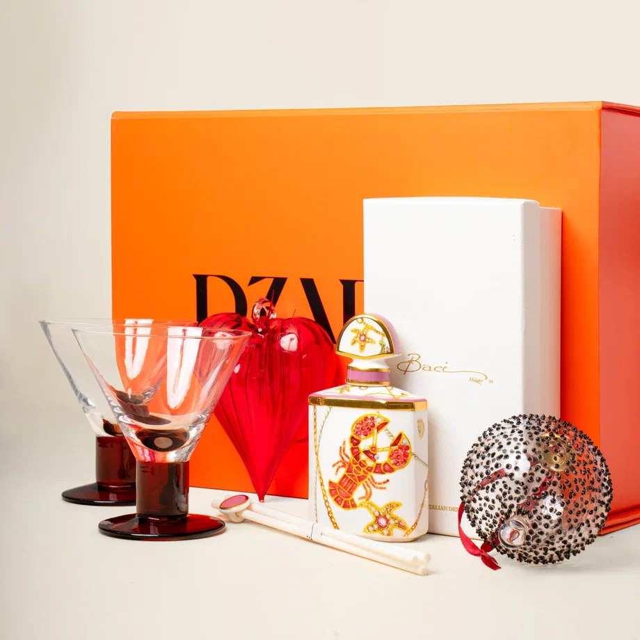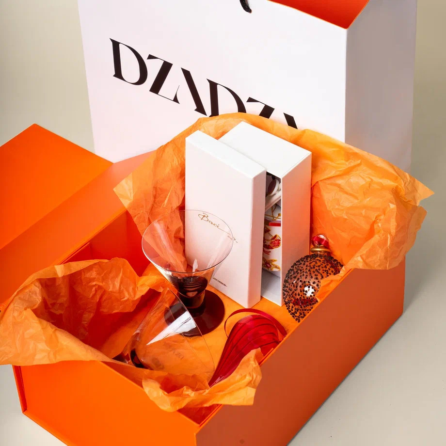 Сет представлен с наполнением: бокс, креманки 2 шт, новогодние игрушки, декантер
