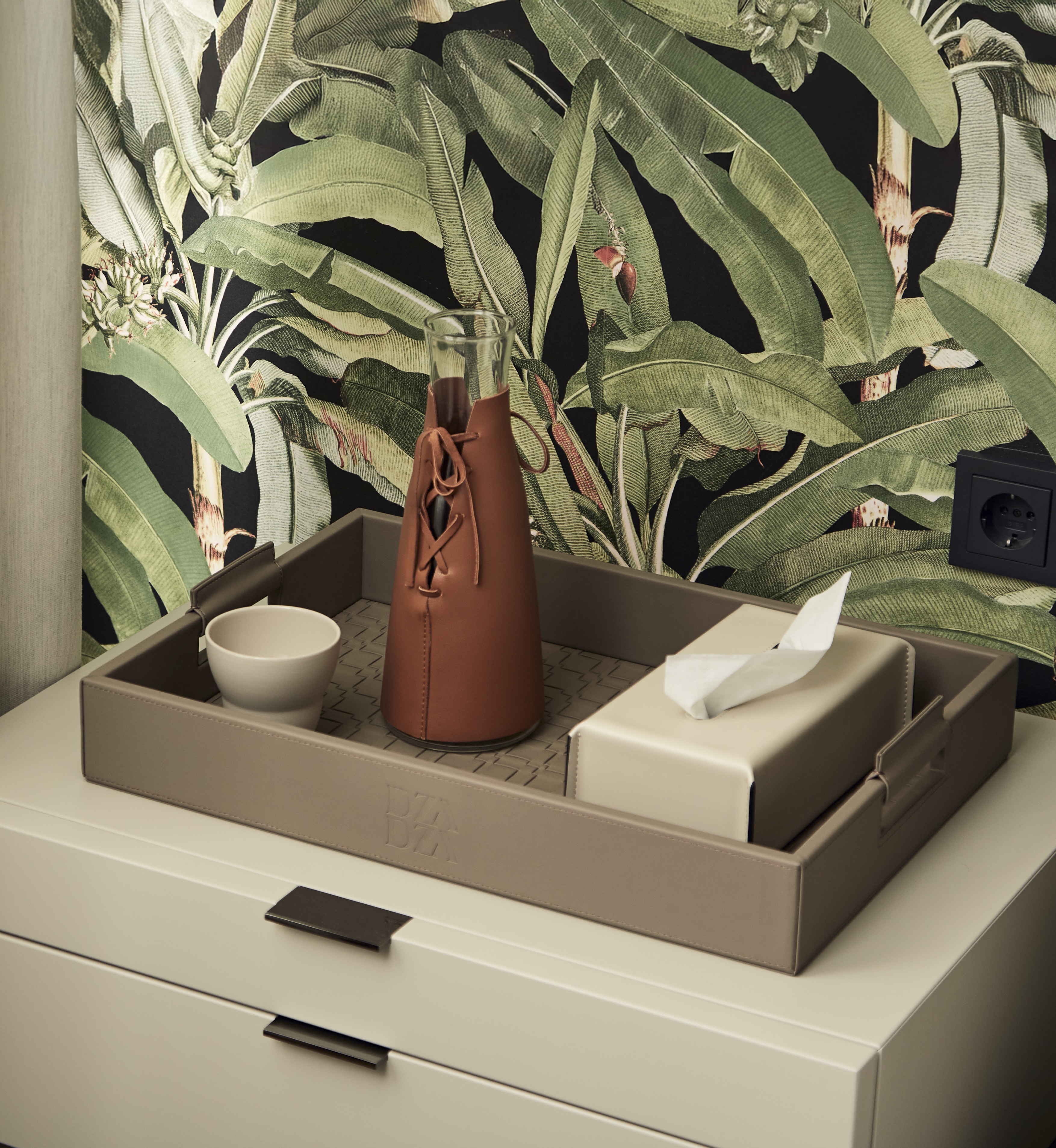 Кожаный поднос с ручками инкрустированный плетенной кожей.