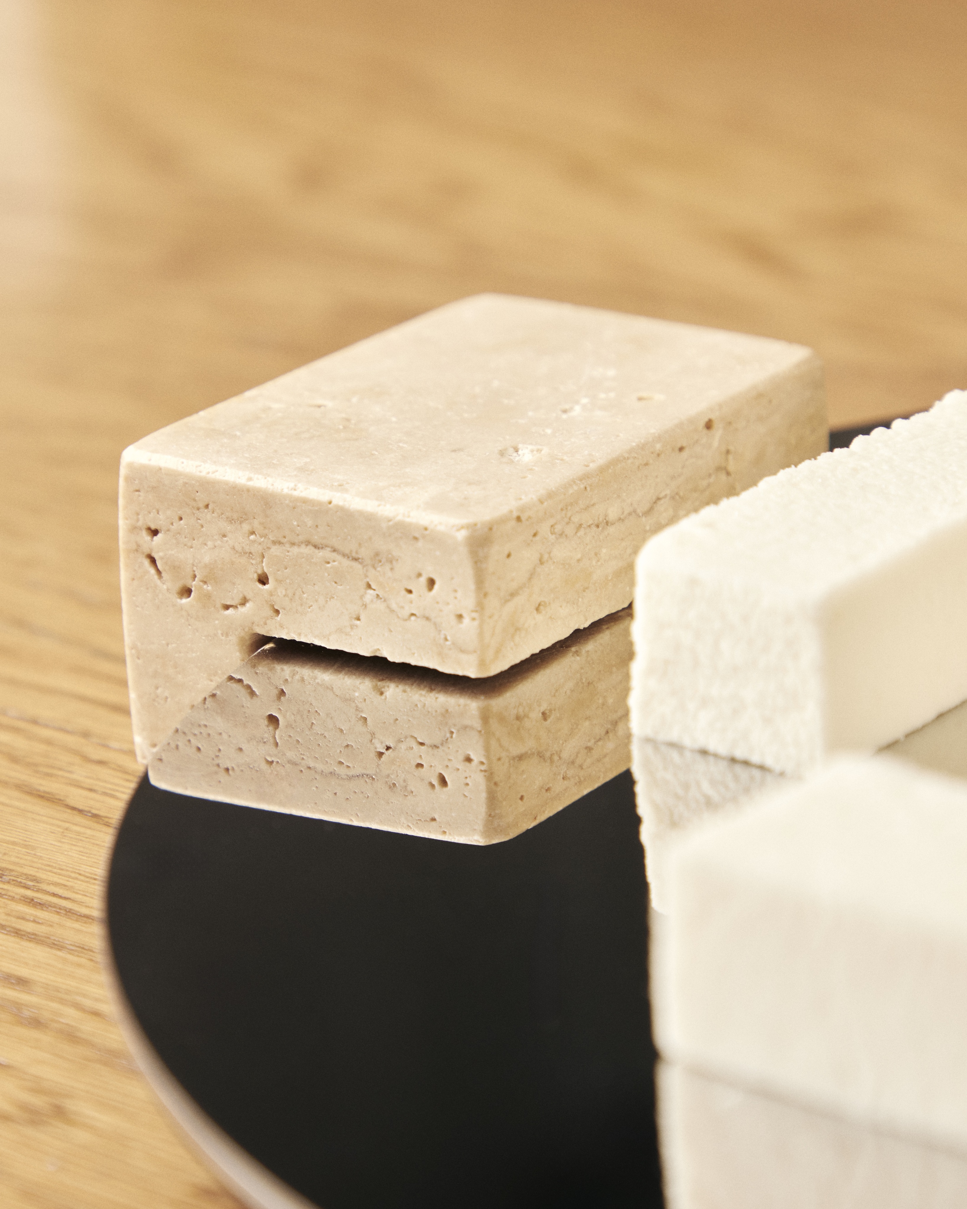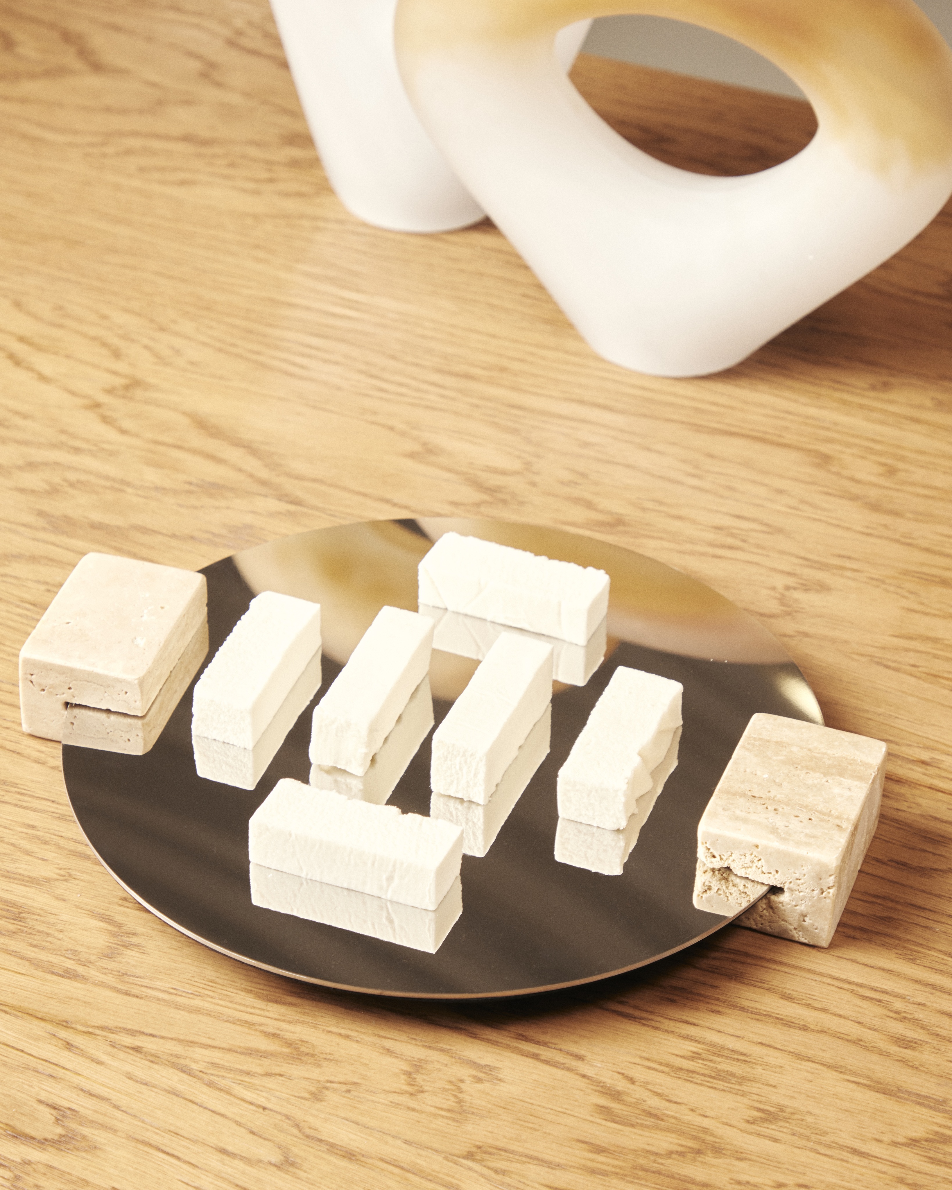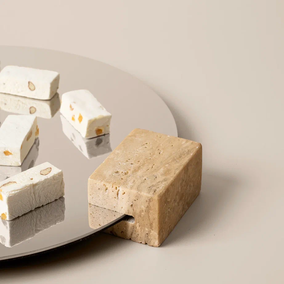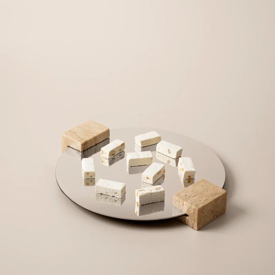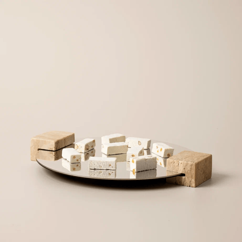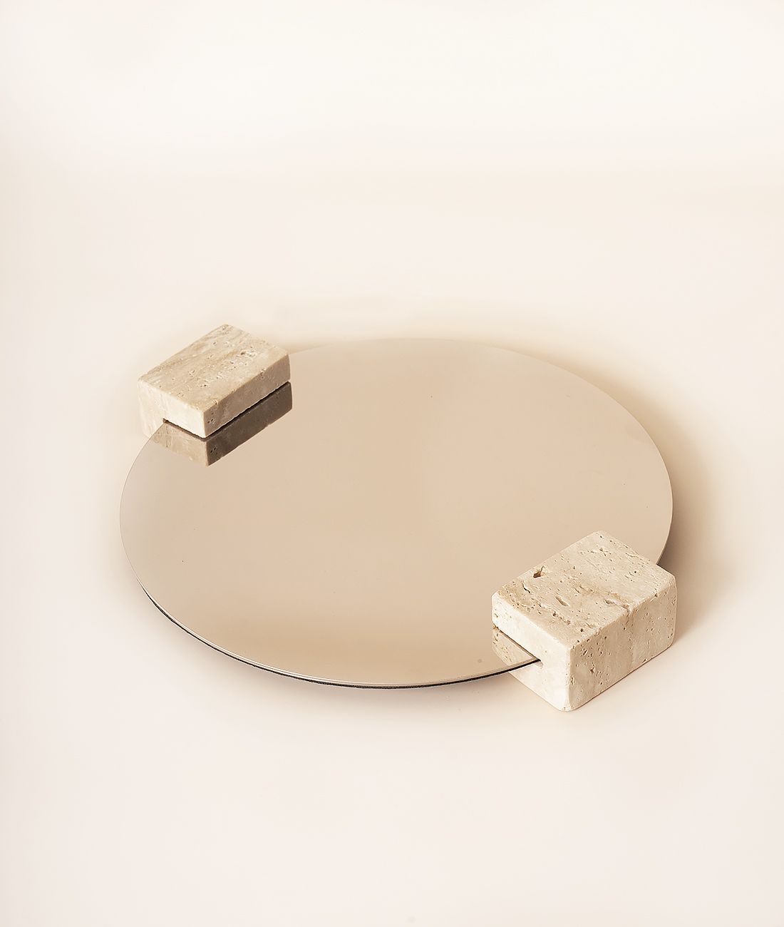 Поднос круглый зеркальный выполнен из нержавеющей стали с зеркальным наполнением и ручками из природного камня травертин