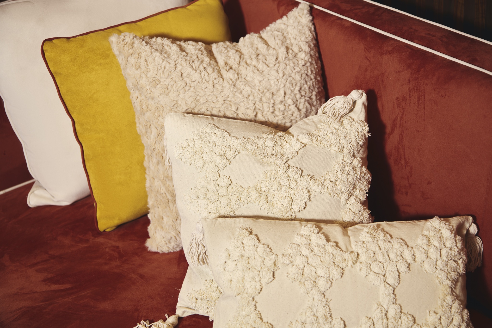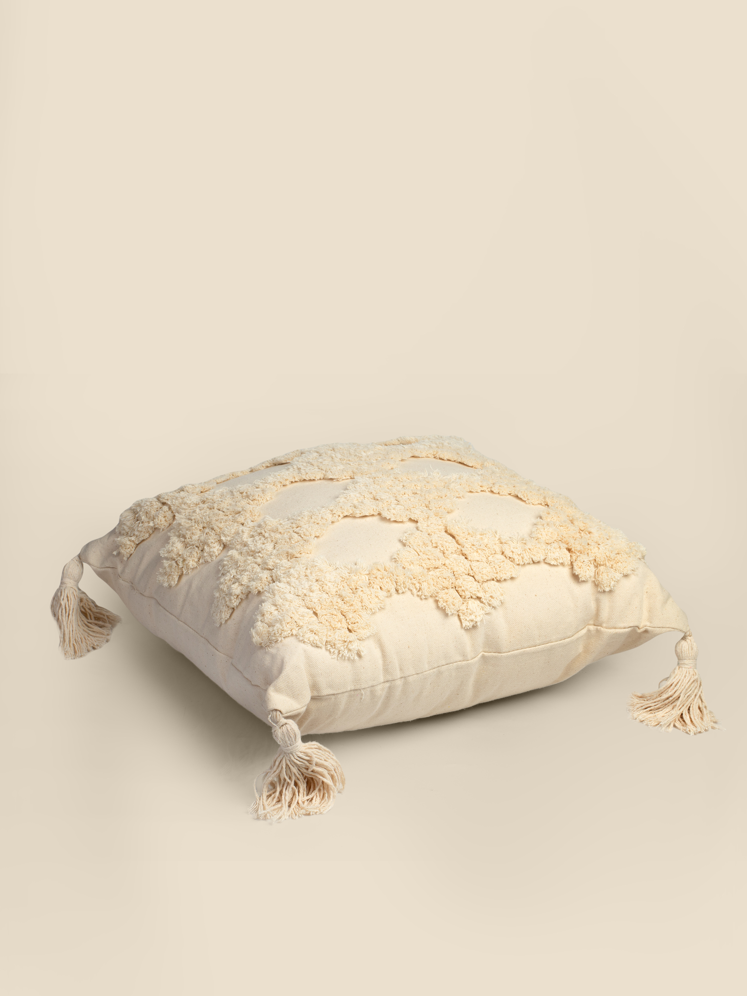Декоративная подушка из 100% льна с объемным рисунком. Углы оформлены кистями. В комплект входит внутренняя подушка.
