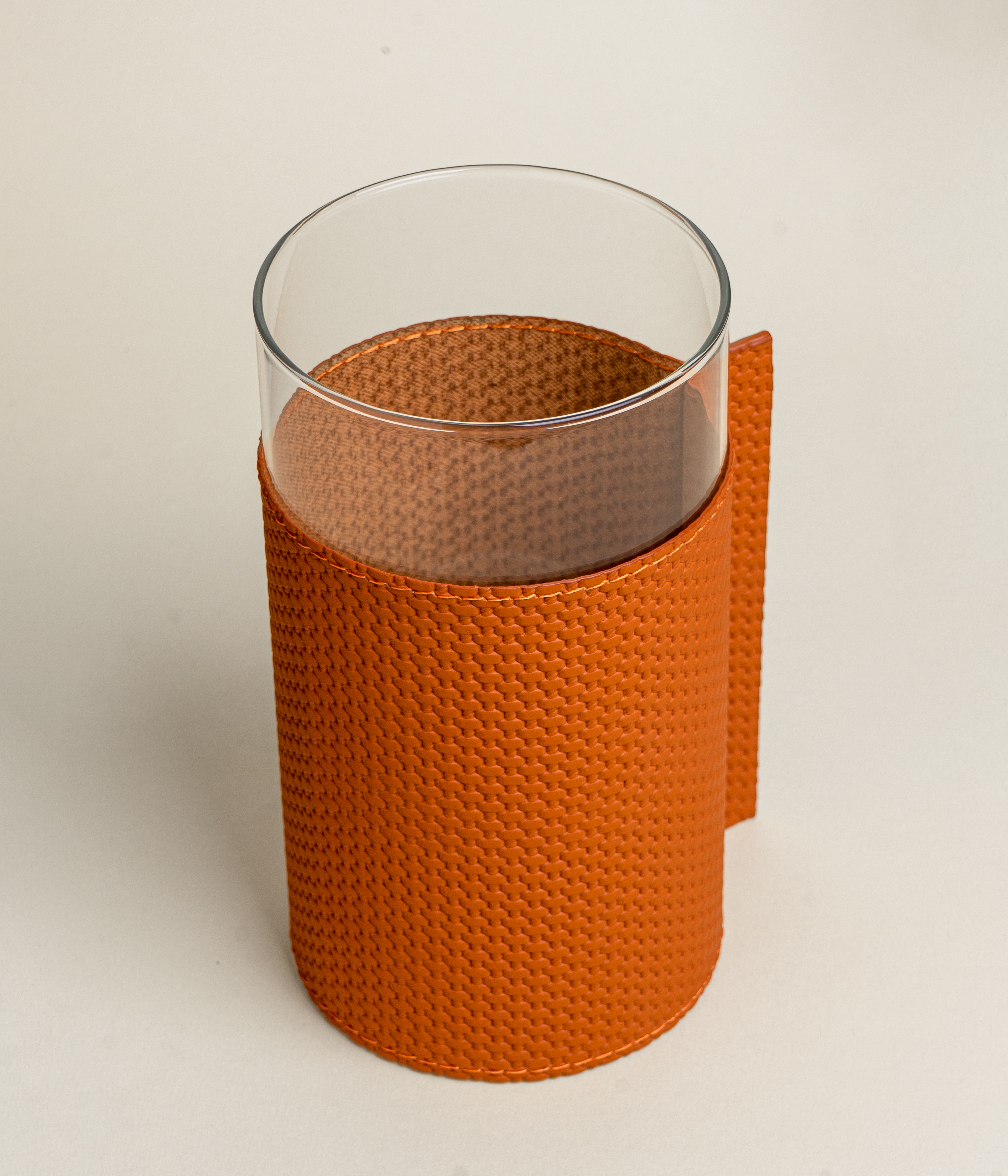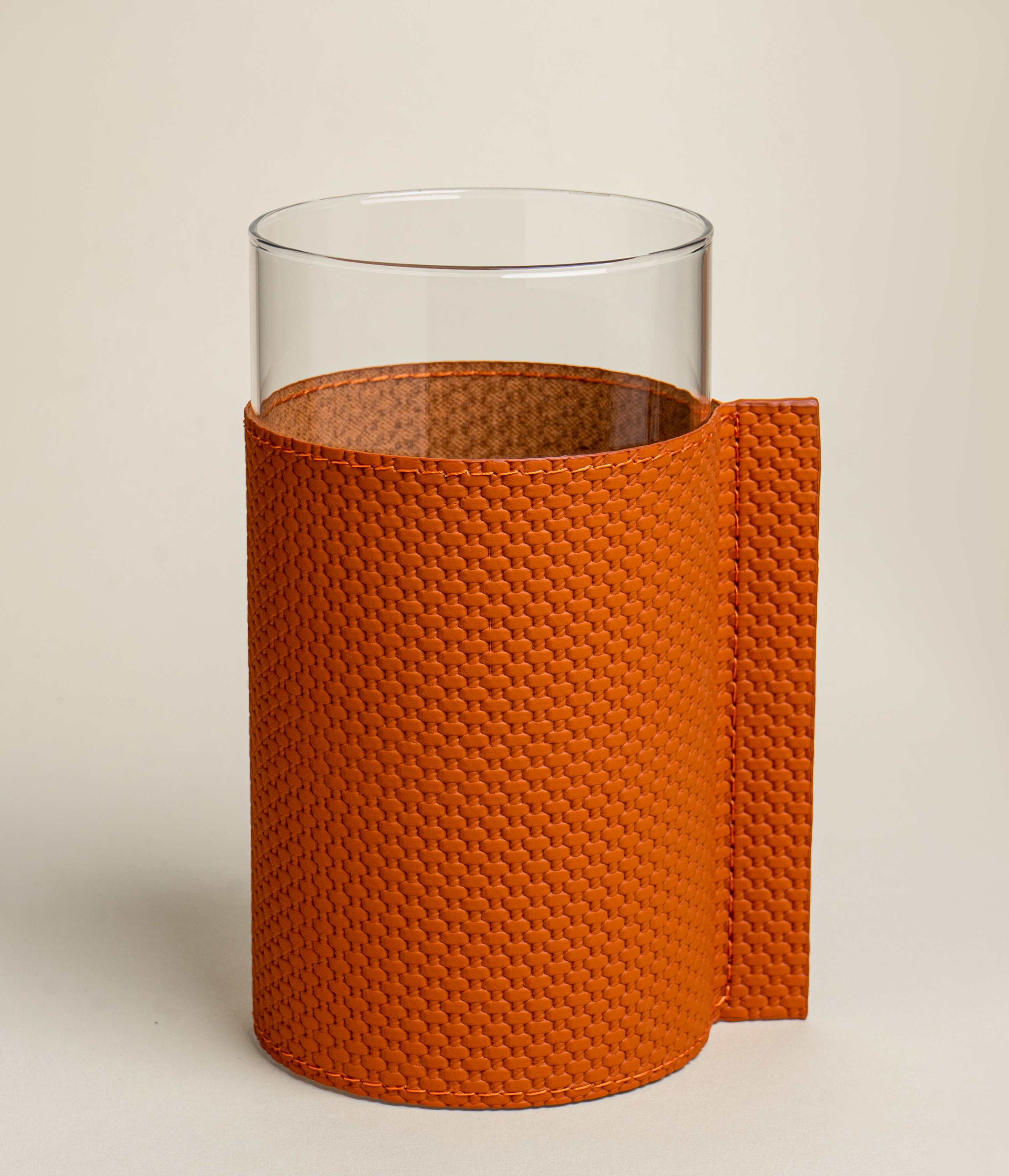 Стеклянная ваза в акцентном чехле из прессованной кожи станет украшением любого интерьера. Чехол помимо декоративной функции выполняет также практическую — позволяет вазе не скользить в руках.